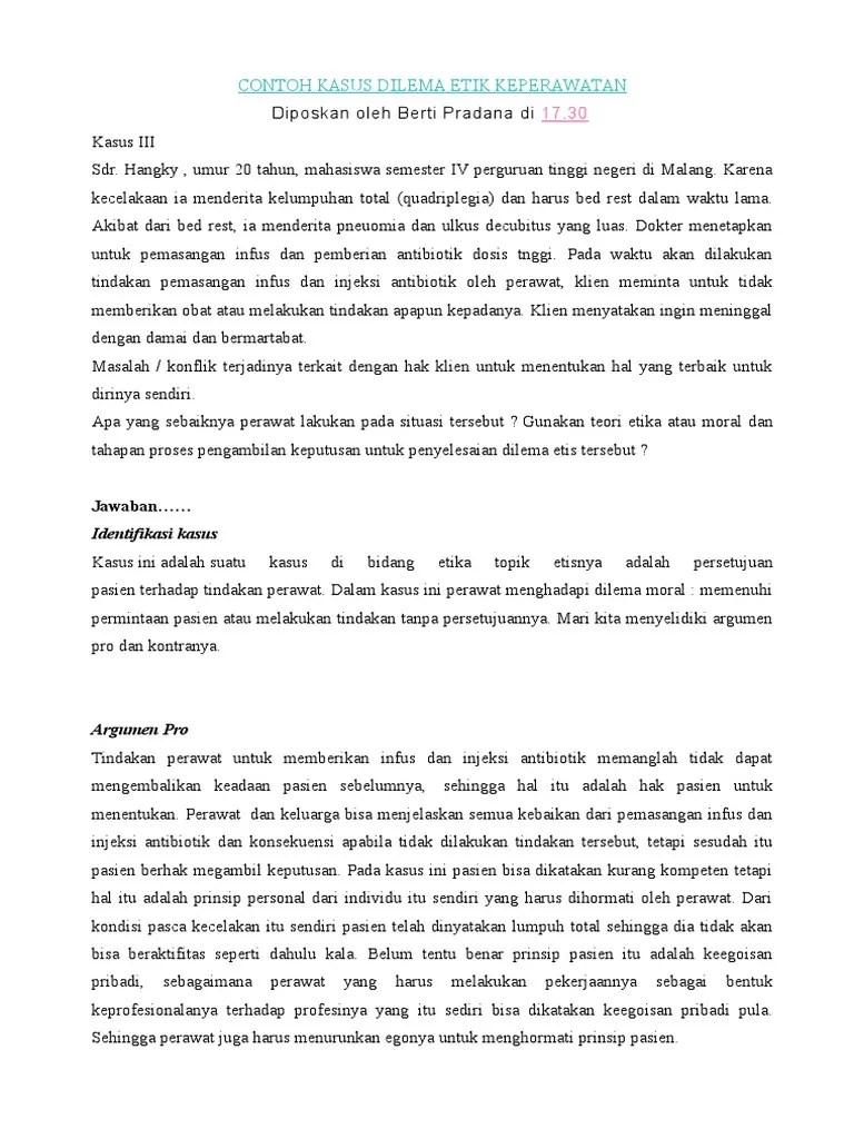Prinsip moral dalam menyelesaiakan dilema etik keperawatan. Konsep komunikasi terapeutik dalam keperawatan, prinsip komunikasi. Teori etik menurut masanya, dilema etik dan contoh pada praktik klinik, . Artikel ini mendiskusikan tentang dilema etik yang terjadi pada kasus penolakan . Hal lain yang juga dapat menimbulkan dilema etik dalam praktik . Dialog komunikasi terapeutik perawat dan pasien. Dialog komunikasi terapeutik perawat dan pasien 2015 (52) october (1) june (25) may (18) april (4) march (4) about me. Seorang remaja (sebut saja gilda) telah mengalami korban bulieng dari teman sekolah sekelasnya. Melanggar otonomi / dilema etik 3. *dosen program studi d iii keperawatan fikes unsiq wonosobo. Bab 7 komunikasi dalam manajemen keperawatan. Naskah role play dilema etik keperawatan. Contoh penggunaan telenursing dalam pelayanan keperawatan yaitu melakukan.